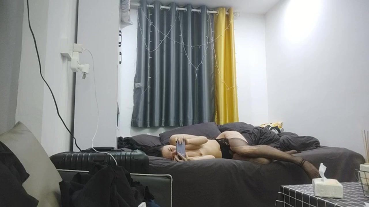 小嫩妹喜持久的累瘫在床,玩着手机再也不想起来了。