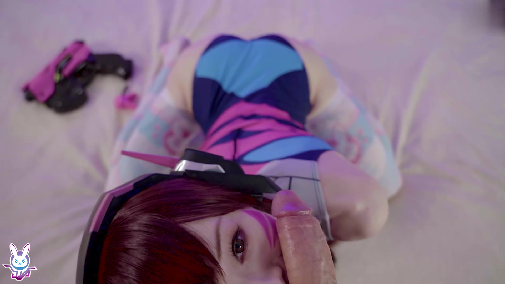 可爱唇钉妹子COS守望先锋DVa自摸啪啪拨开内裤露无毛粉逼,深喉口交翘起大白屁股双洞换着插。